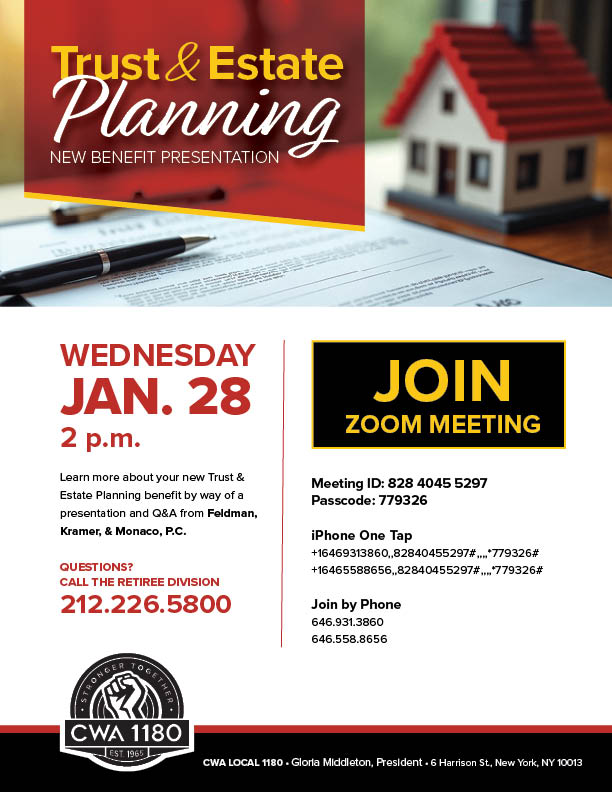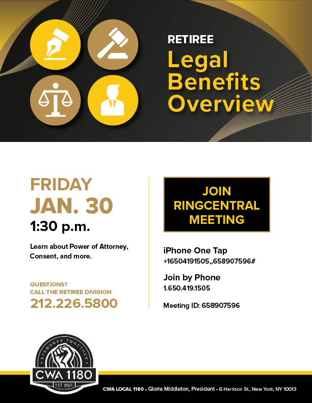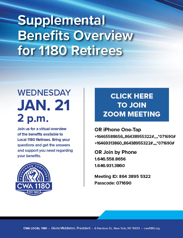 Join us for a virtual overview of the benefits available to Local 1180 Retirees. Bring your questions and get the answers and support you need regarding your benefits.